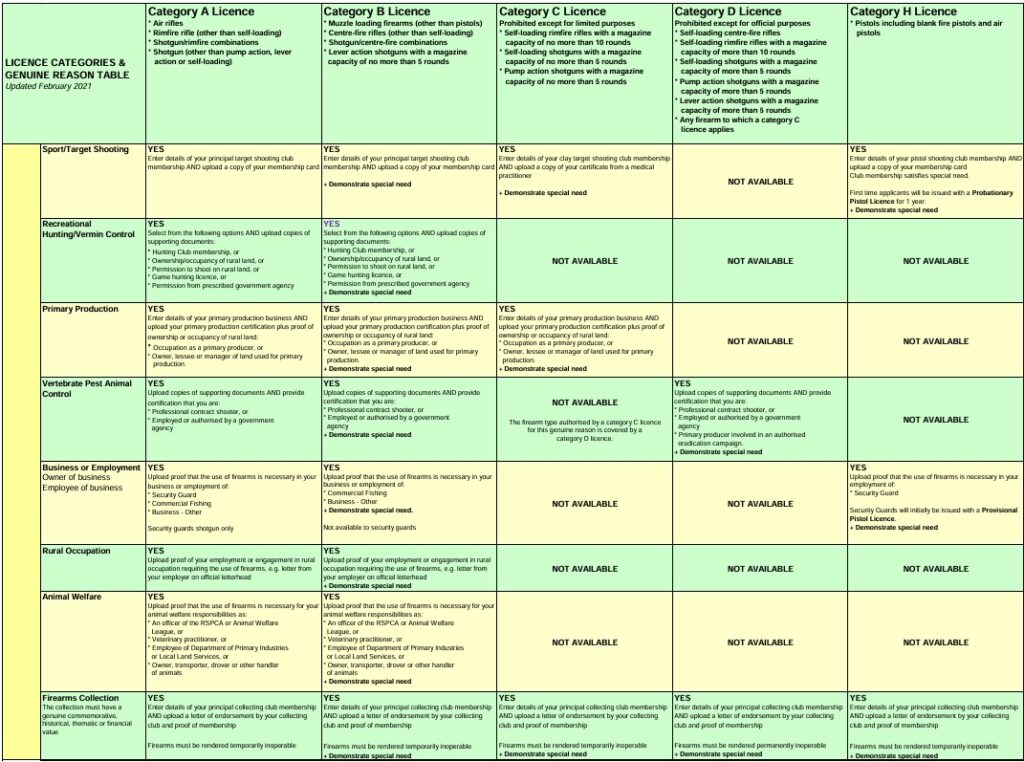 Click below to view a table of “genuine reasons” and what obligatory evidence firearm licence holders need to provide per reporting period.