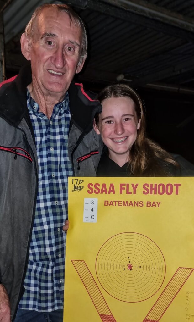 Stella (pictured with her Grandfather, Bruce) won the Juniors category and finished 5th overall, just one point behind her mother, Cassandra, who also made the top 5 with minimal prior fly shooting experience.